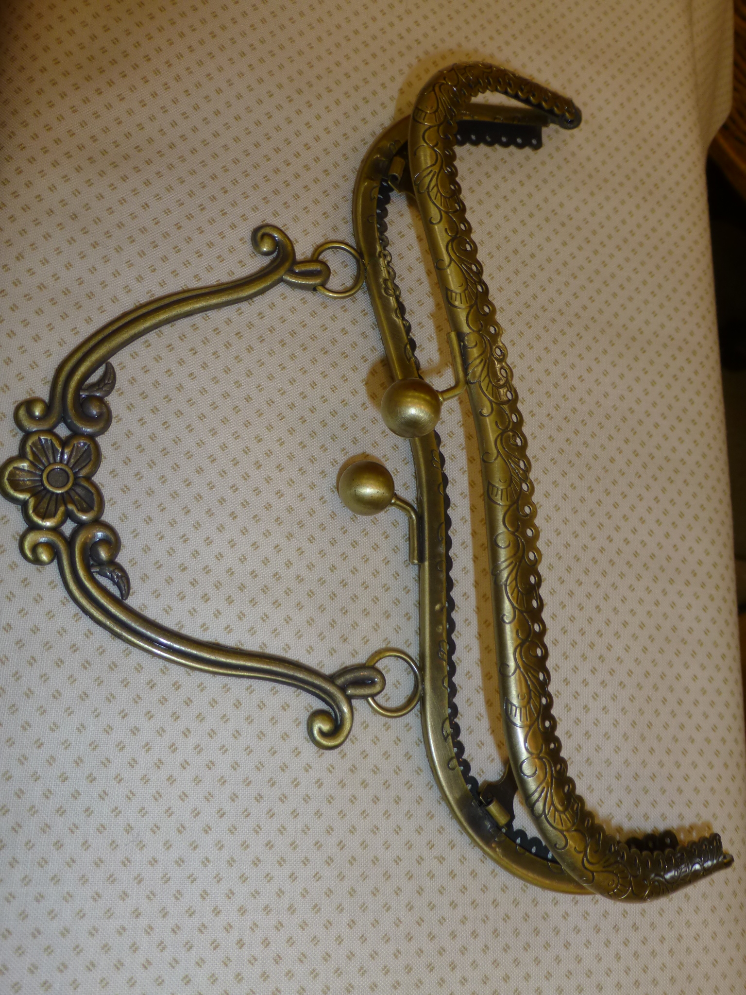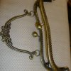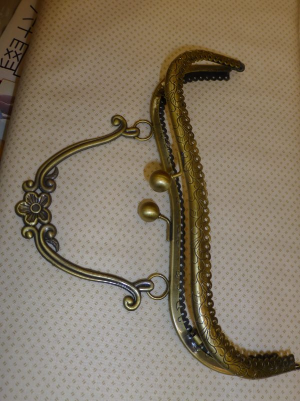 Fermoir en acier laitonné gravé, surmonté de 2 boules pour la fermeture, et d’une poignée de transport.